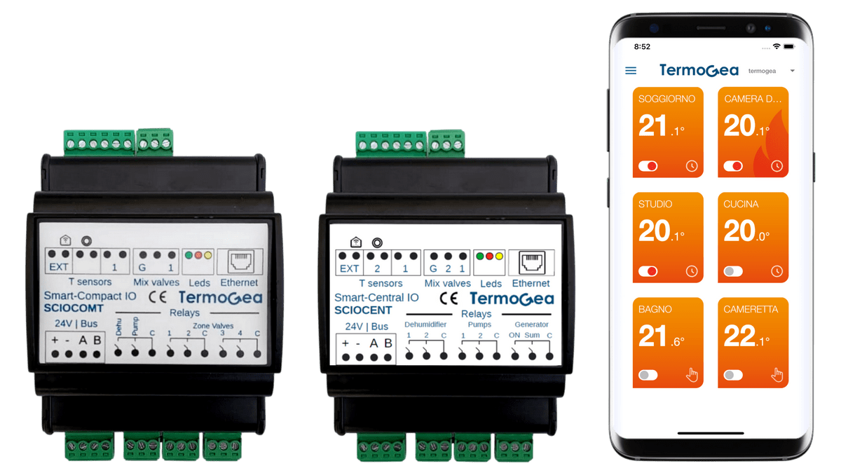 | SMART-CENTRAL I/O | SCIOCENT | Centralina PLUG & PLAY per termoregolazione. Controllo remoto con cloud e App fino a 8 zone radiante e/o fancoil. Funzioni: Condominio, Cambio Stagione, Curva Climatica. Uscite per: 2 Miscelatrici 0-10V; 2 Circolatori; 2 Deumidificatori; Generatore e Stagione. Ingresso sonda T esterna. Ingressi per 2 sonde T di mandata. Connettore Modbus per collegamento sonde, termostati e schede relè. Connettore Ethernet per collegamento a Internet. Collegamento WiFi per collaudo tramite APP Termogea. Alimentazione 24VDC. |