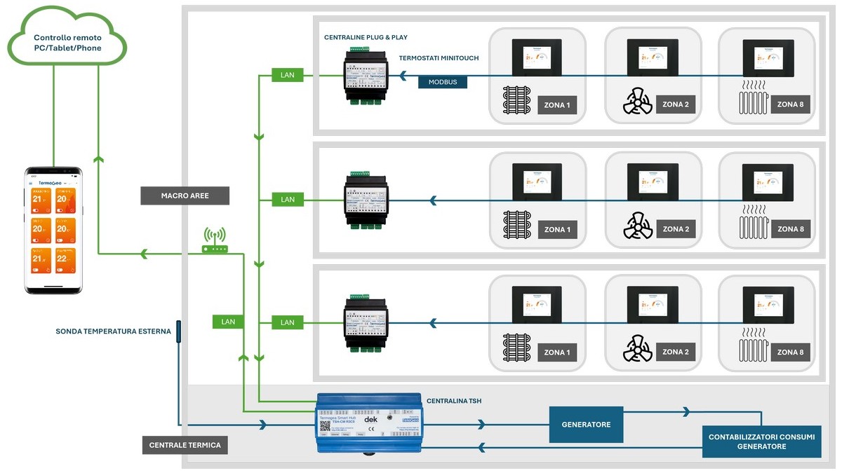 Il Sistema Termogea per la gestione smart della climatizzazione nei grandi edifici prevede la suddivisione dell’edificio in macro aree. Ogni macro area è gestita dalla Centralina di termoregolazione Plug & Play Smart Central che può controllare fino a 8 zone. La centralina comunica direttamente con la centrale termica via rete LAN attraverso la Centralina Termogea Smart Hub (TSH). Entrambe le centraline sono infatti dotate di gateway integrato con interfaccia Ethernet. Il gateway permette anche la comuncazione al cloud Termogea per la gestione dell’impianto da remoto.