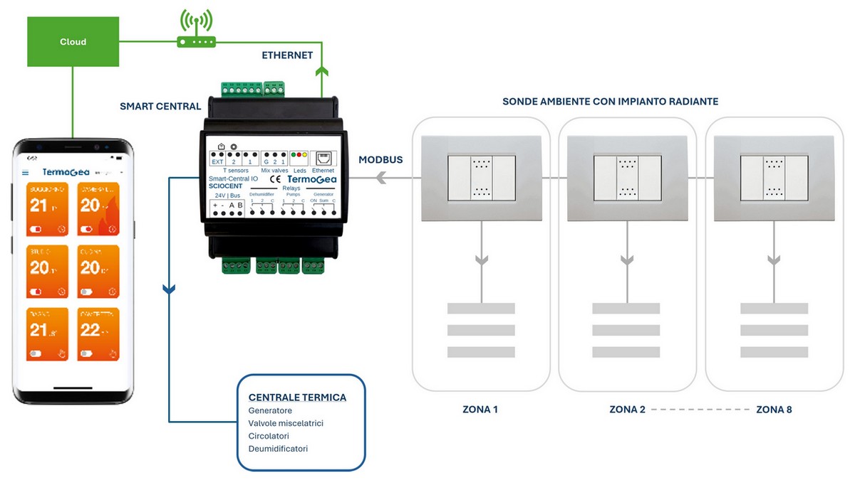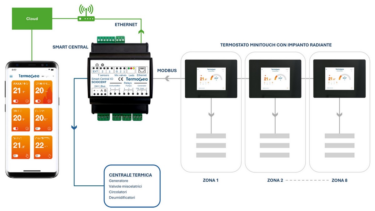 The kit consists of the Smart Central unit and environmental sensors placed in each zone. Smart Central is a Plug & Play system. With built-in software, it identifies the number and type of sensors used during the first startup of the system. No configuration is required. The Compact Radiant Kit is therefore a preconfigured room climate control system, ready to manage radiant floor or ceiling systems.