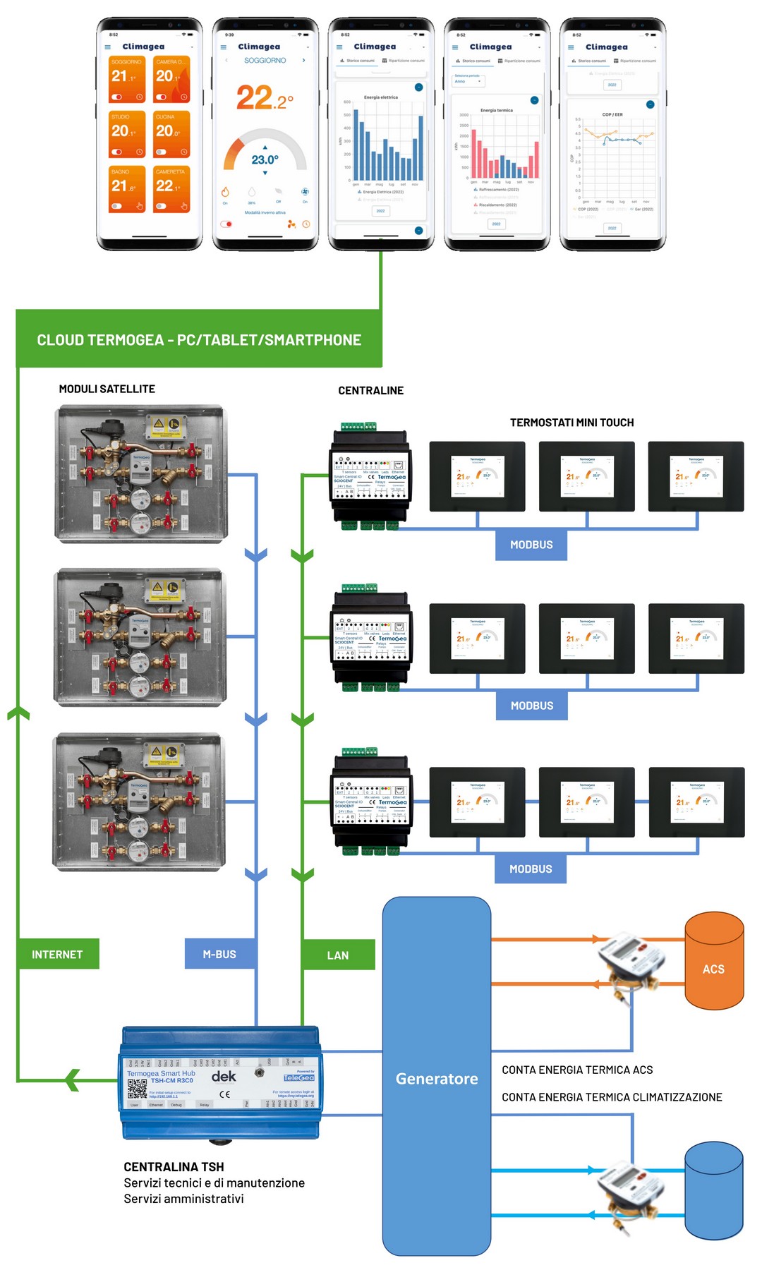 The Termogea System uses the Plug & Play Smart Central climate control unit for each apartment, which can manage up to 8 zones. The climate control unit communicates directly with the Thermal power plant via LAN through the Termogea Smart Hub (TSH) control unit. Both units are equipped with an integrated gateway with an Ethernet interface. In addition to internal communication via LAN, the TSH unit also communicates data externally via internet to the Termogea Cloud. The Cloud System is dedicated to complete remote management of the centralized condominium system.