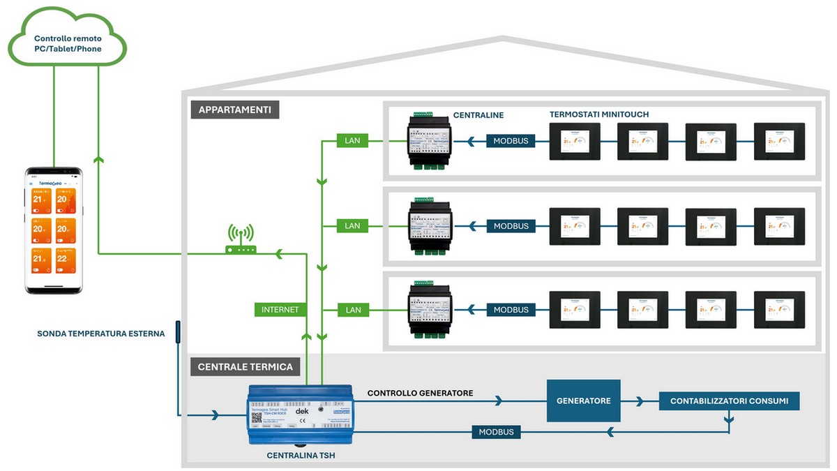 Termogea has developed an innovative communication system between the Thermal power plant and apartments for centralized condominium systems. This technology allows for real-time intervention on climate control, reducing energy costs and ensuring comfort.